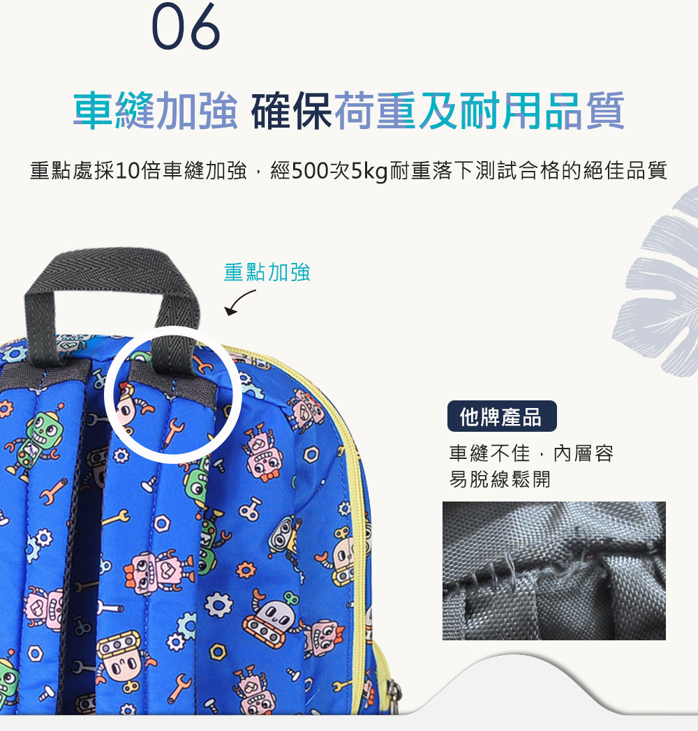 | 特點 | 正面及肩帶兩側反光條、內層姓名布條、防潑水面料、肩帶緩衝減壓棉 |