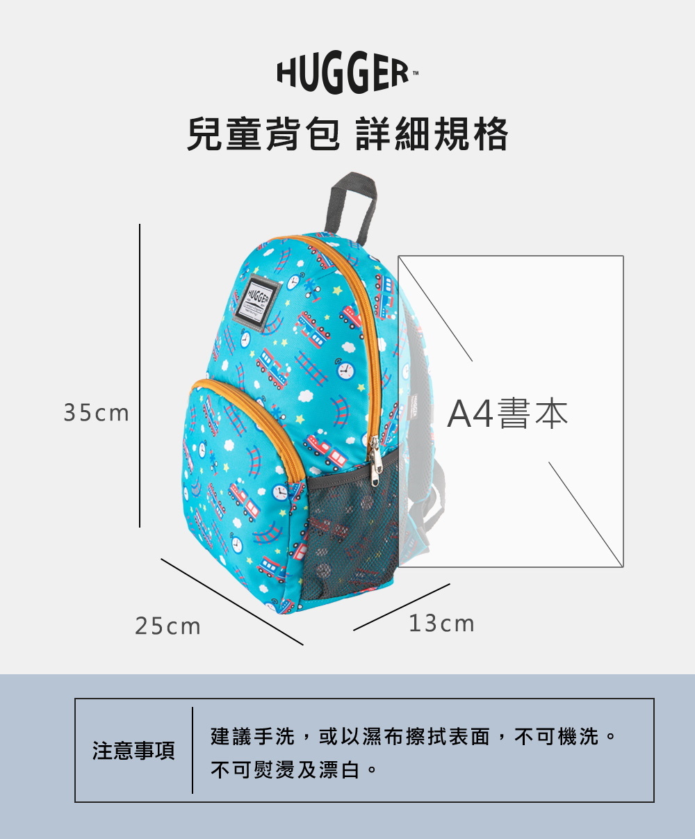 Q:兒童背包的尺寸?A:幼童背包的尺寸是25x 13 x 35 cm。這是一款媽媽圈內推薦的背包,專門設計給5~8歲孩子使用。Q:建議多高的孩子可以使用?A:建議大約100公分到130公分的孩子使用。此外也要看小朋友在使用上的需求。可以放到幼兒園A4書本當作書包使用。Q:兒童背包的設計?A:Hugger兒童背包設計的分層有一個主要的袋口,非常大的開口,可以讓孩子非常容易將物品或是備用的衣服放到背包裏面。