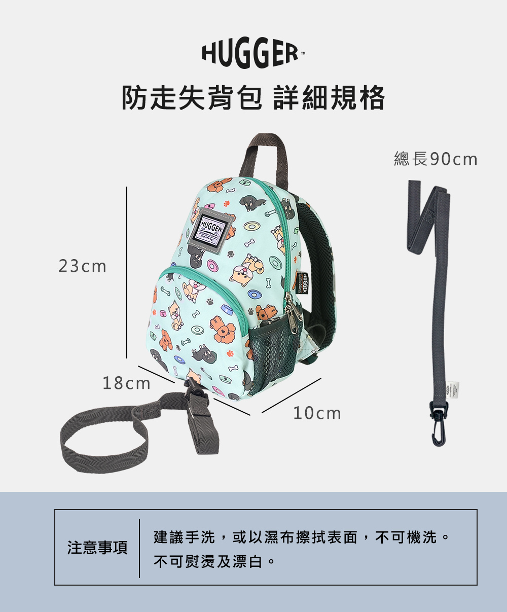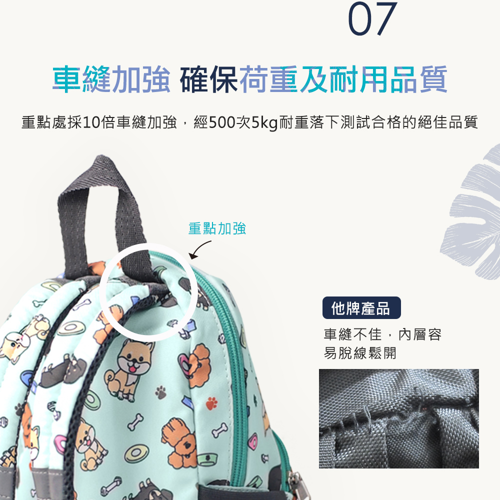 | 特點 | 正面及肩帶兩側反光條、可拆式牽繩(長90cm)、防潑水面料、肩帶緩衝減壓棉 |